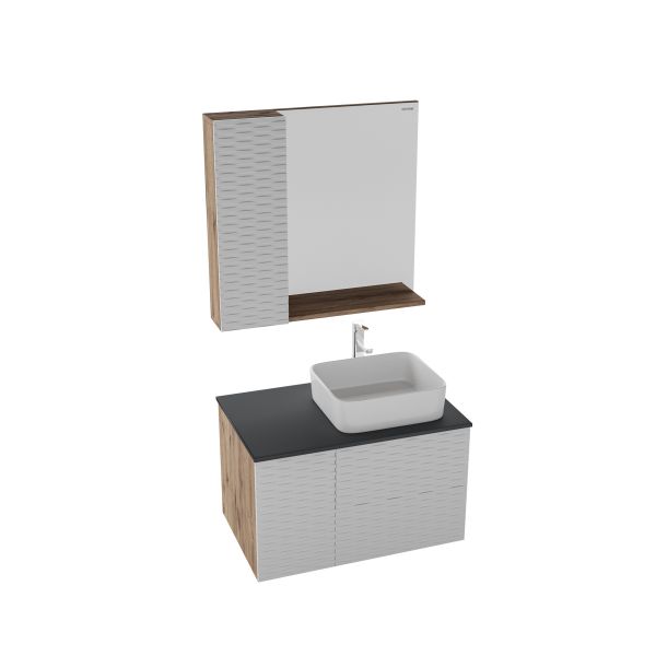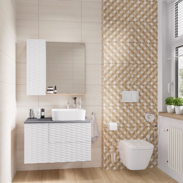 Тумба подвесная Альба 80 см - функциональное и практичное исполнение. Белый матовый цвет с 3D рисунком безупречно сочетается с фактурой под дерево и позволяет тумбе органично вписаться в интерьер ванной комнаты.