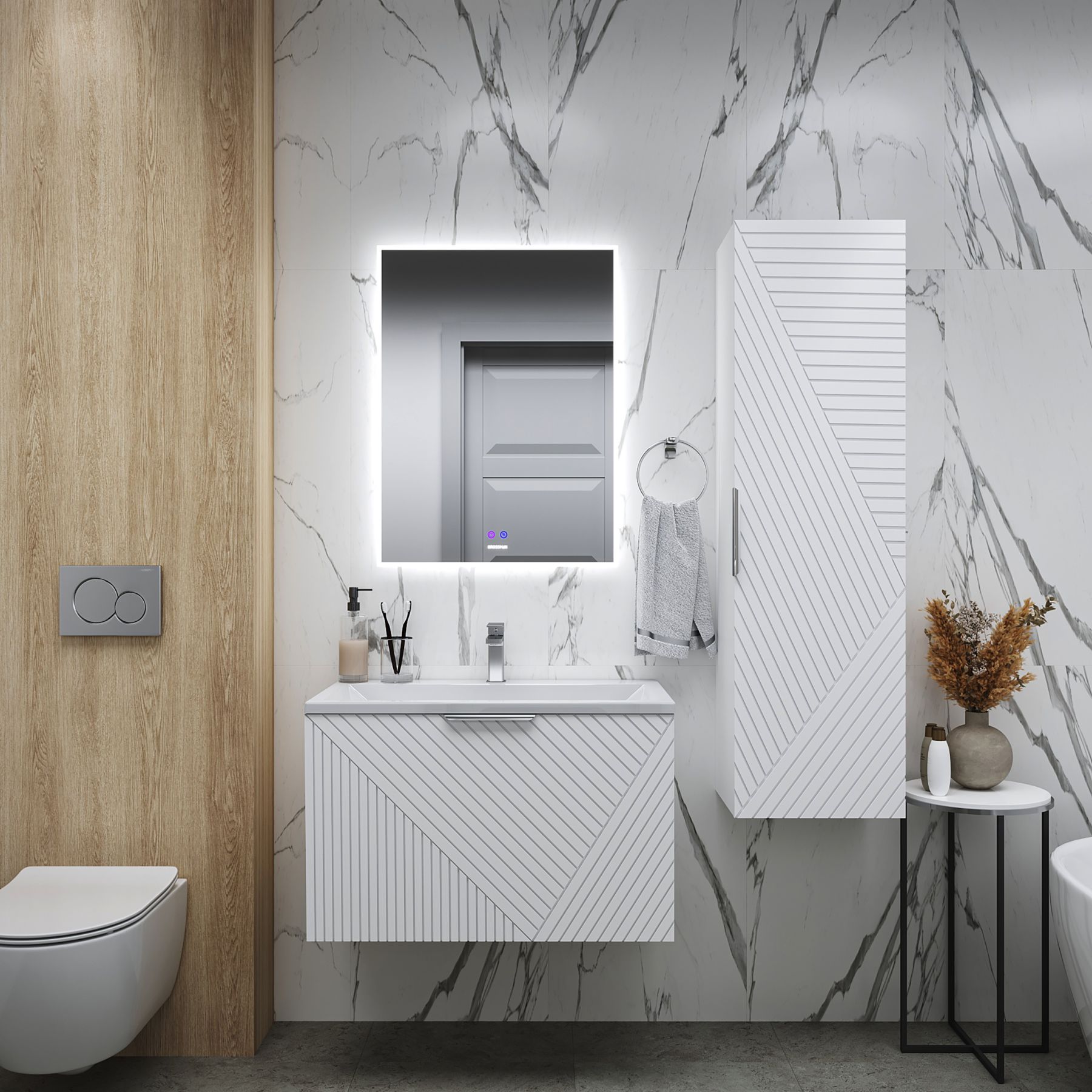 Корпус и фасады выполнены из влагостойкого МДФ, покрытого высококачественной матовой краской. Это гарантирует устойчивость к влаге и долговечность при ежедневном использовании в условиях повышенной влажности.Размеры: