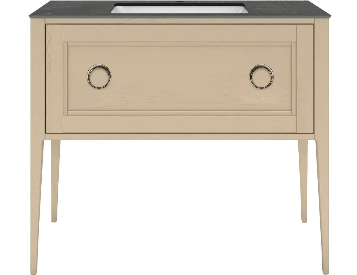 Напольная тумба с одним выдвижным ящиком выполнена из массива ясеня с отделкой «открытая пора». Вместительный ящик с плавным закрыванием украшен двумя крупными ручками. Сочетается с керамическими столешницами PLAZA Classic шириной 100 см. Подходит для установки раковин с типом монтажа «встраиваемая снизу».