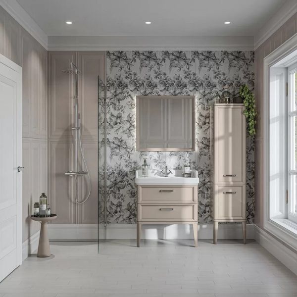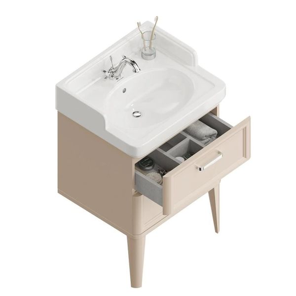В варианте с двумя ящиками у тумбы POMPEI появляются две высокие ножки. Фасад мебели выполнен со скруглениями по двум сторонам. В мебели использована качественная амортизирующая фурнитура.   Вместительный ящик тумбы внутри сделан с отделкой «лён антрацит», характерной для большинства новых моделей мебели KERAMA MARAZZI. Тёплый цвет «камео бежевый» хорошо сочетается с широким спектром стилей, поэтому такую мебель можно использовать как в современных, так и в традиционных интерьерах.