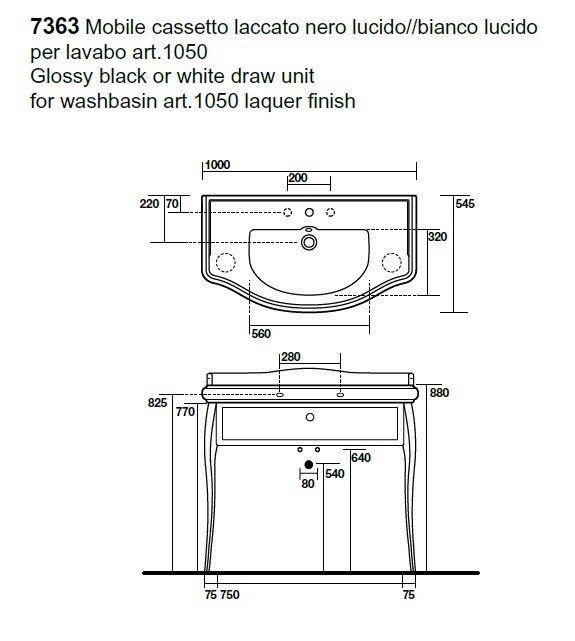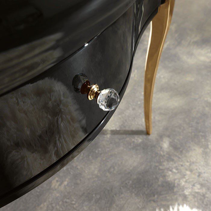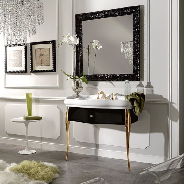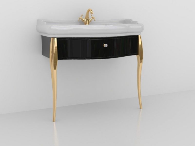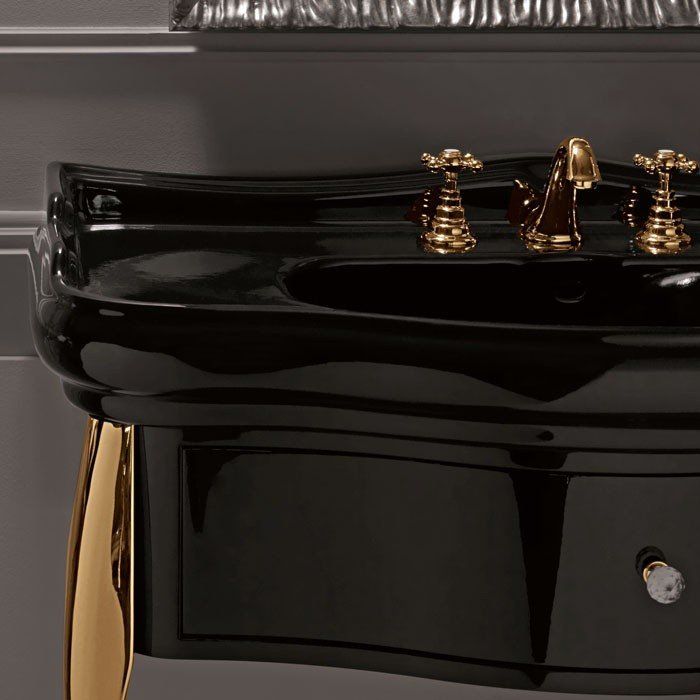 Тумба под раковину Kerasan Retro 7363K4 напольная черная золотоKerasan Retro 7363K4 Напольная консоль черная, с золотыми ножками и ручкой кристалл/золото, для монтажа с раковиной 105001/04, размер 100х54х77 см. С одним выдвижным ящиком. Раковину приобретать отдельно.