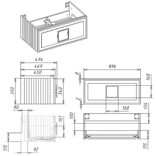 Габариты корпуса тумбы (ШхВхГ): 976х350х494 мм.