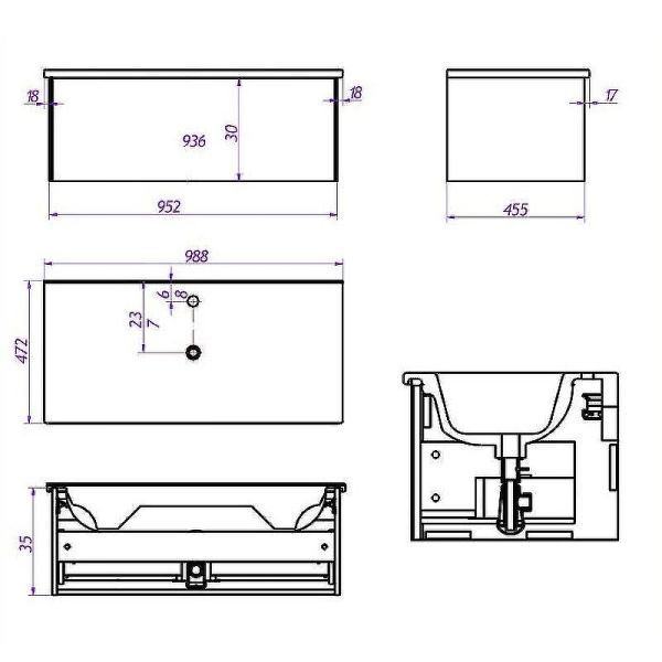 Габариты корпуса тумбы (ШхВхГ): 952х350х455 мм.