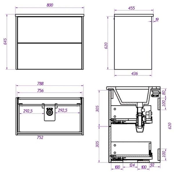 Габариты корпуса тумбы (ШхВхГ): 788х620х436 мм.