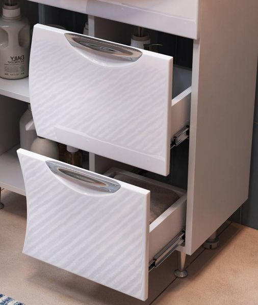 1 дверца; 2 ящика; 1 полка ЛДСП; ручка металлическая хромированная; опоры конус регулируемые. Подробнее
