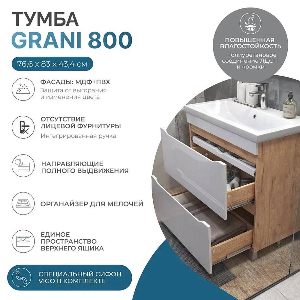 Тумба под раковину напольная VIGO Grani 203 дуб золотой, 80 см. Гарантийный срок 2 года. Монтаж: напольный. Доводчик: нет. Нажимной механизм: нет.