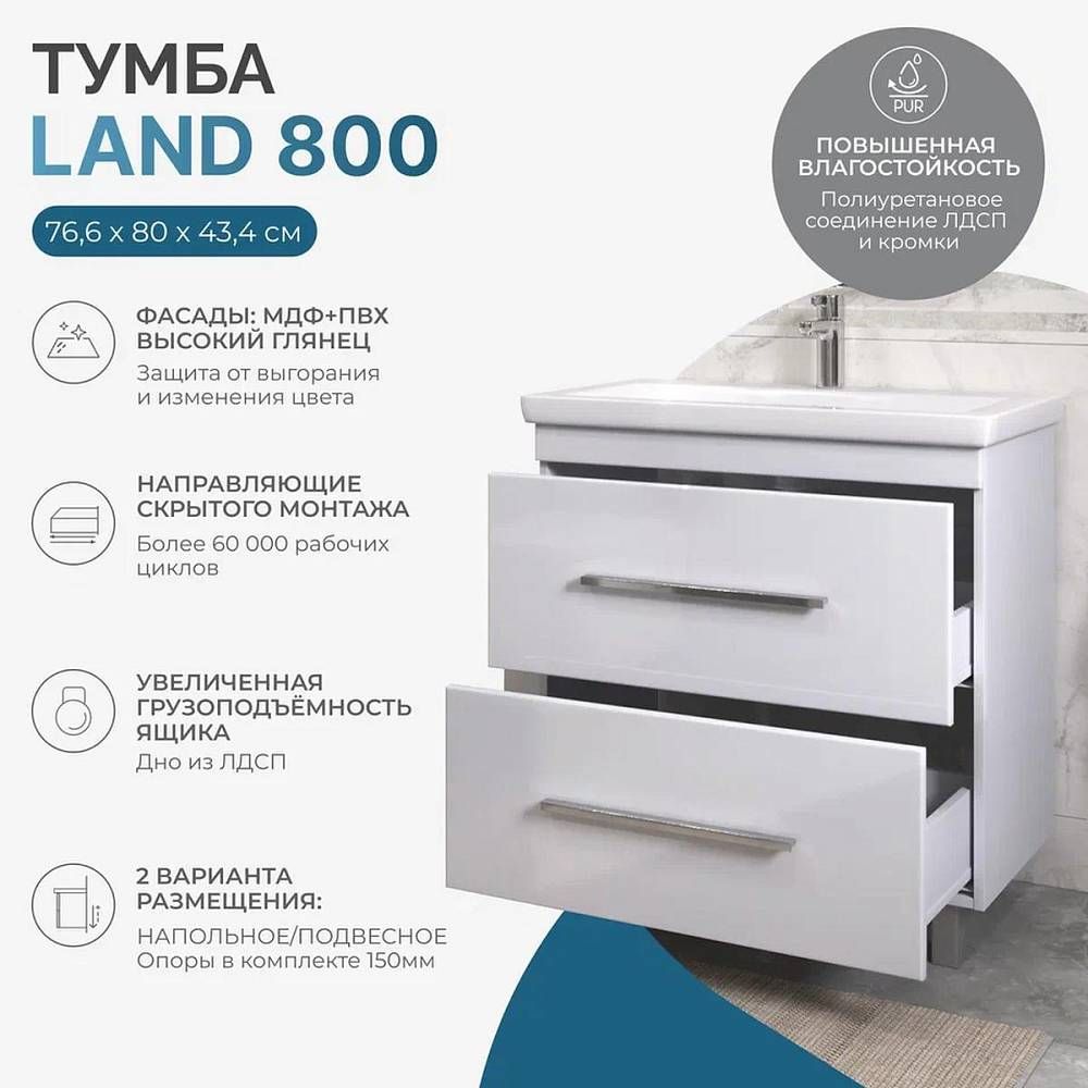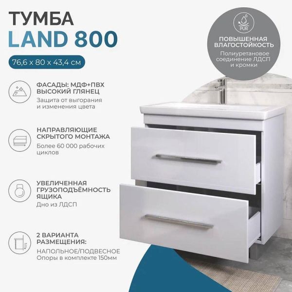 Тумба под раковину напольная VIGO Land 021, 80 см. Гарантийный срок 2 года. Монтаж: напольный. Доводчик: да. Нажимной механизм: нет.