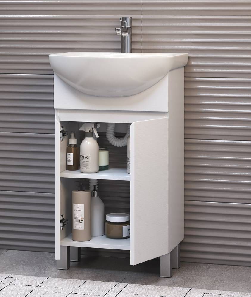 2 дверцы, 1 полка ЛДСП, опоры регулируемые квадратные. Специальный сифон Vigo в комплекте.Материал корпуса и фасада: влагостойкая ЛДСПДверцы: петли с механизмом плавного закрыванияОтсутствие лицевой фурнитуры – интегрированная в фасад ручка