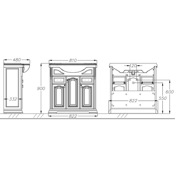Габариты корпуса тумбы (ШхВхГ): 822х900х332 мм.