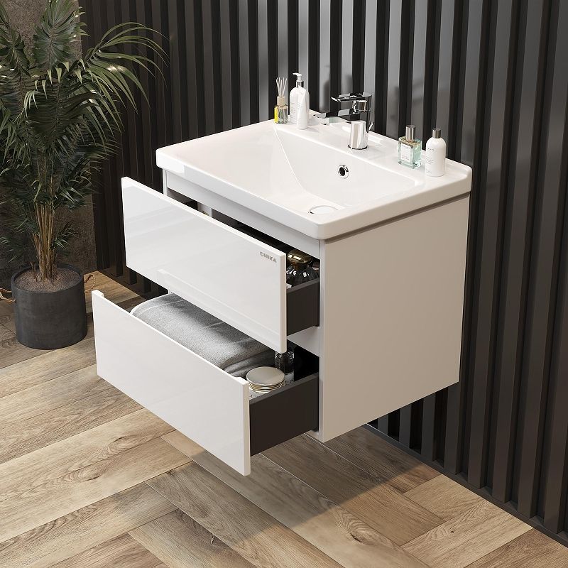 Подвесная тумба для ванной комнаты Onika Эвада 70 сочетает в себе стильный минималистичный дизайн, белую глянцевую поверхность и высочайшее качество исполнения.