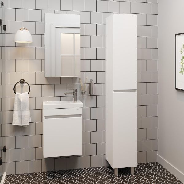 Тумба имеет белый глянцевый фасад и строгие формы без декора. За дверцей с интегрированной ручкой скрывается пространство с полкой для размещения необходимых бытовых принадлежностей.