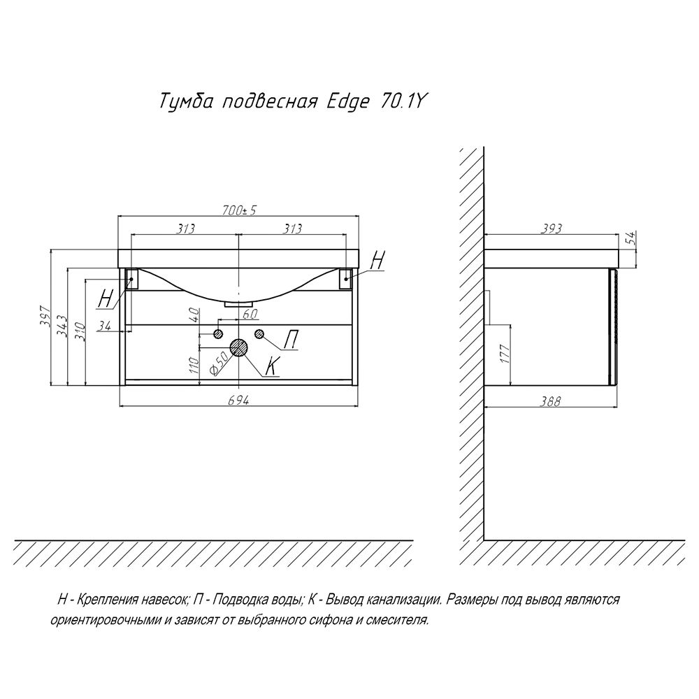 Тумба под раковину подвесная Velvex Edge tp.EDG.9696.70.1Y графит, 70 см: 1 выдвижной ящик с механизмом открывания push-to-open.