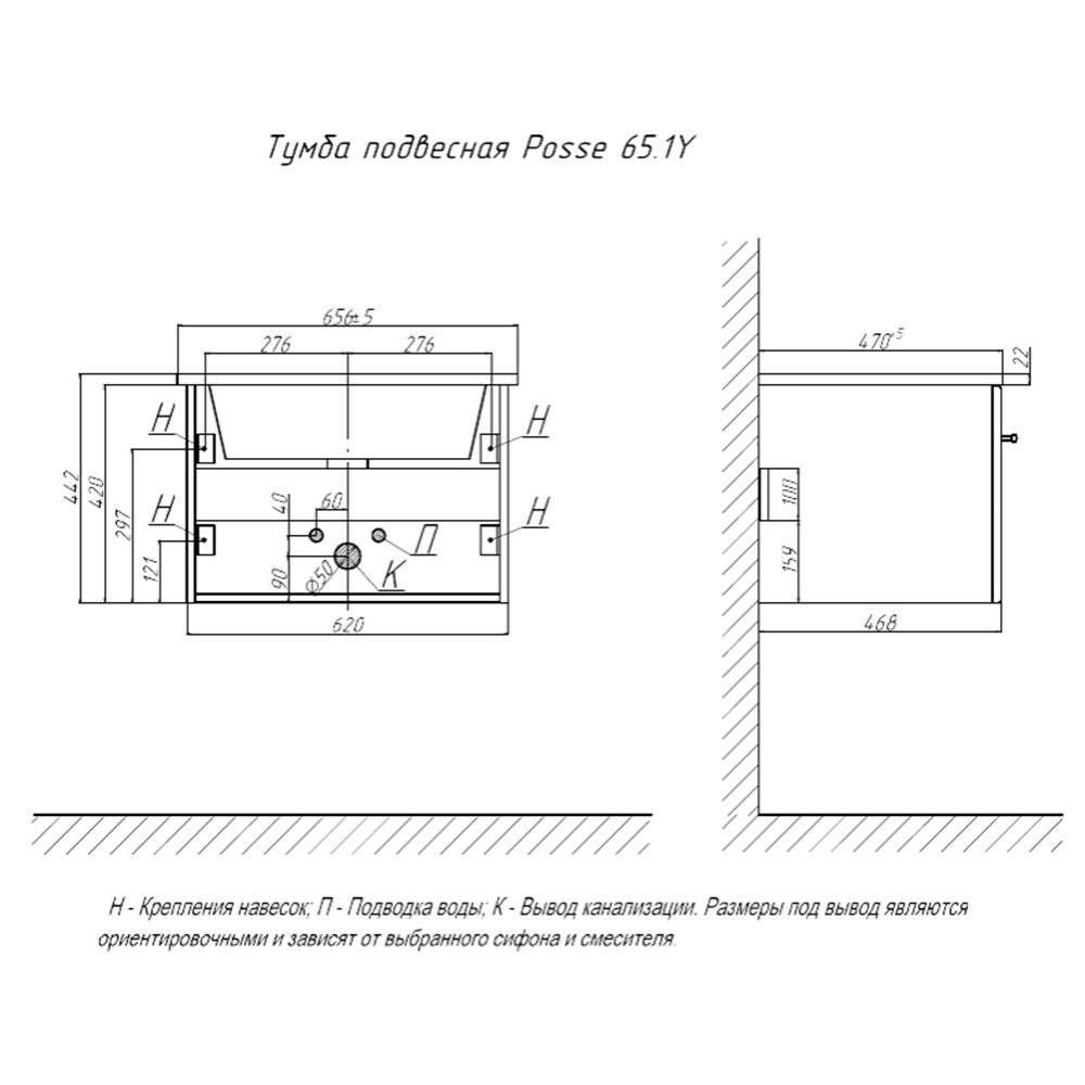 Тумба под раковину подвесная Velvex Posse tp.POS.OSK.65.1Y верде, 65 см: 1 выдвижной ящик с механизмом плавного закрывания.