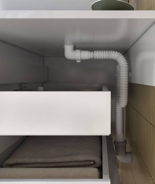 2 ящика. Специальный сифон Vigo в комплекте.Материал корпуса: влагостойкая ЛДСПМатериал фасада: ЛМДФПокрытие фасада: пленка ПВХЯщики: направляющие полного выдвиженияОтсутствие лицевой фурнитуры – интегрированная в фасад ручка