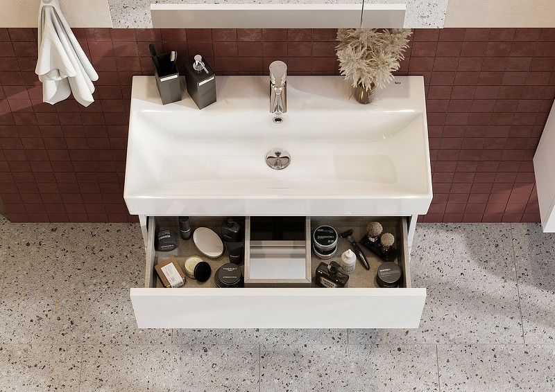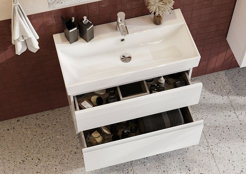 Тумба под раковину позволяет использовать мебель Oleta даже в небольших ванных комнатах. Несмотря на компактную глубину, тумба комплектуется раковиной Oleta с достаточно вместительной чашей. Лаконичный и современный дизайн раковины притягивает к себе взгляд. 2 выдвижных ящика тумбы установлены на направляющие HETTICH, которые гарантируют продолжительную безупречную функциональность и максимальный комфорт эксплуатации. Скрытый монтаж не портит элегантный дизайн мебели, а возможность полного выдвижения обеспечит быстрый доступ к необходимым предметам. Внутренняя отделка ящиков выполнена в цвете бежевый текстиль, приятна на ощупь и предотвращает скольжение предметов. Профильная ручка во всю ширину фасада удобна в использовании и позволяет сочетать мебель Oleta c различными цветами смесителей и аксессуаров для ванной комнаты. Ручка выполнена в виде J-профиля.