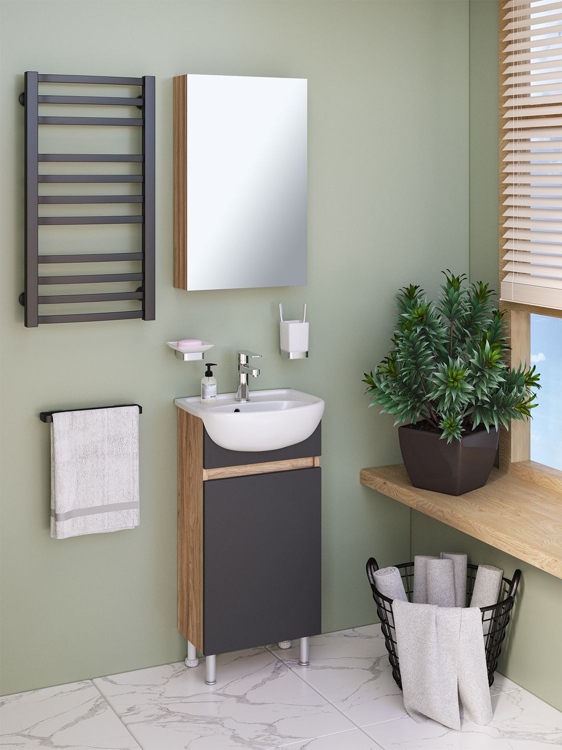 Тумба с раковиной RUNO ЛАДА - модное и оригинальное решение для бюджетного оснащения ванной комнаты. Тумба под раковину ЛАДА (напольная) выполнена в двух цветах - классическом белом и в стильном цвете - графит/серый дуб . Тумба в ванную имеет две распашные дверцы и одну внутреннюю полку. В комплекте идут петли со встроенным доводчиком, 2 хромированные и 2 пластиковые ножки. Тумба для ванной комплектуется раковиной из сантехнического фарфора "Манго" (407х330 мм). Раковина имеет глубину 17 см. Мебель для ванной RUNO - красота и практичность в мелочах!