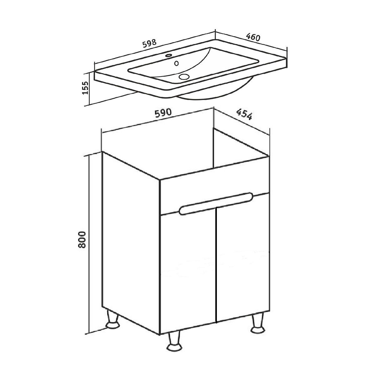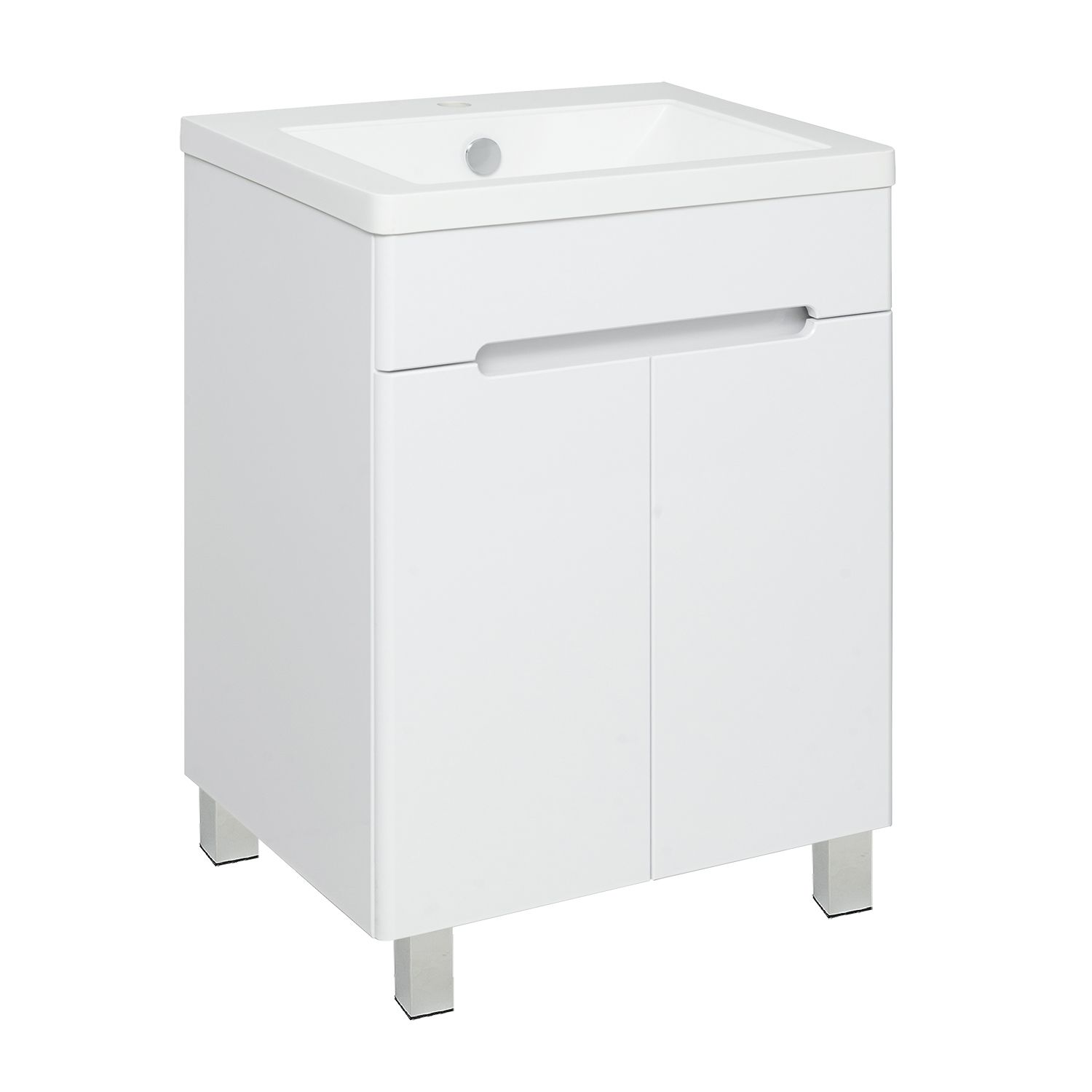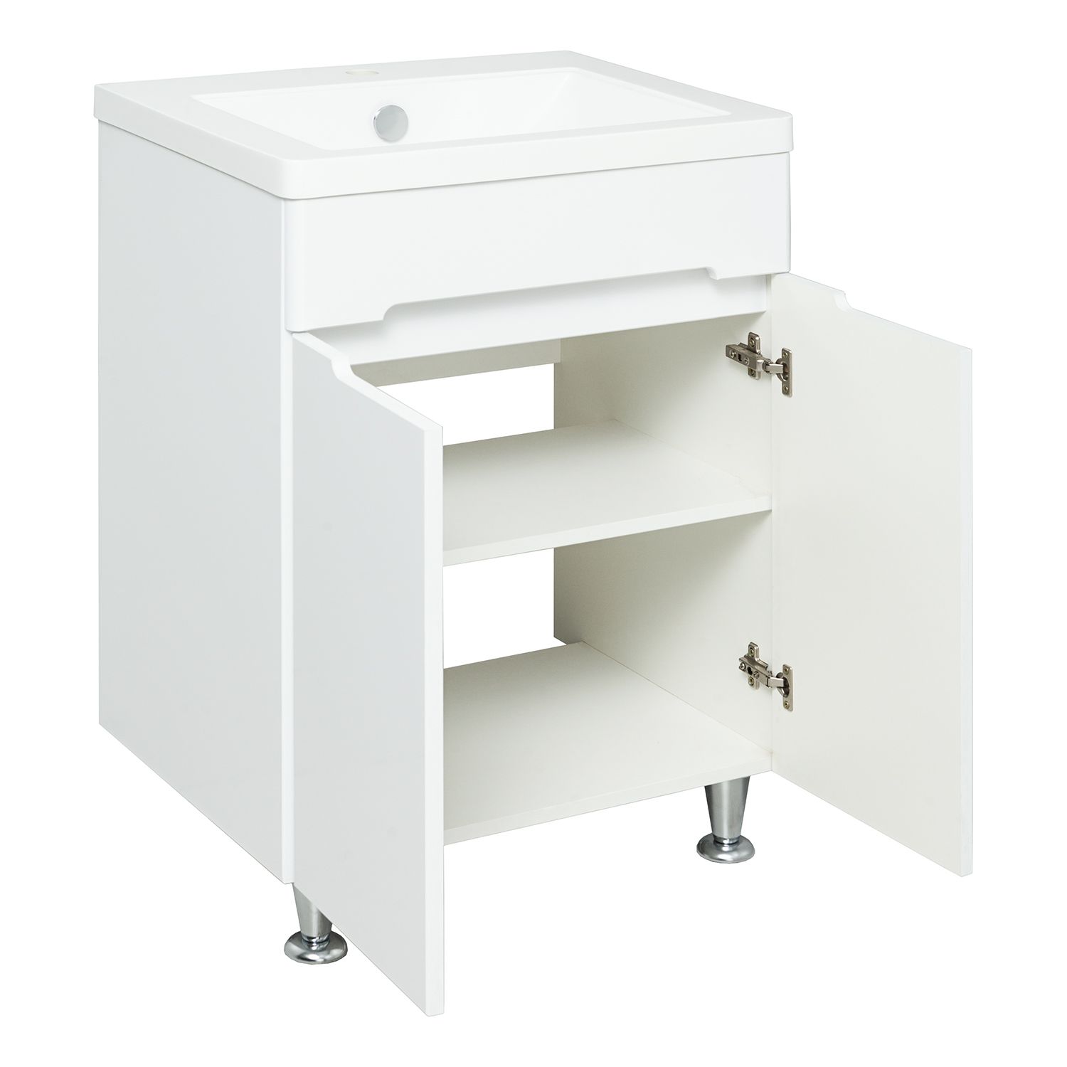 Тумба под умывальник напольная с двумя распашными дверками. Петли со встроенным доводчиком, ножки хром - 2шт, ножки пластик - 2шт.