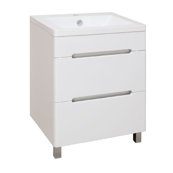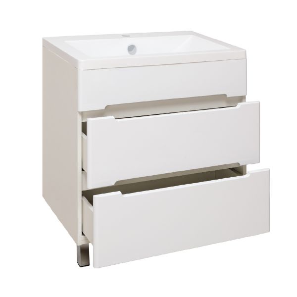 Тумба под умывальник напольная с двумя выдвижными ящиками на шариковых направляющих скрытого монтажа с доводчиком. Ножки хром - 2шт, ножки пластик - 2шт.