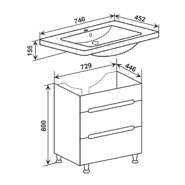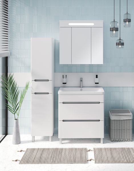 Тумба под умывальник напольная с двумя выдвижными ящиками на шариковых направляющих скрытого монтажа с доводчиком. Ножки хром - 2шт, ножки пластик - 2шт.