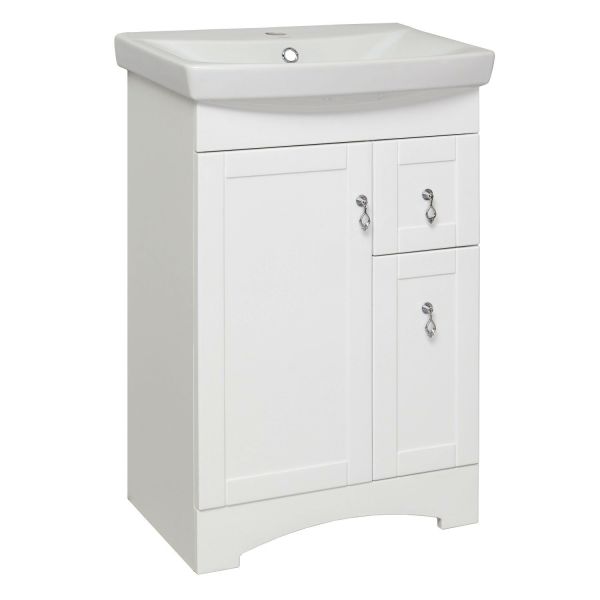 Коллекция мебели «Мерида» выполнена в классическом стиле. Четкие и лаконичные формы, продуманный функционал помогут украсить интерьер любой ванной комнаты. Тумба напольная с двумя распашными фасадами и боковым выдвижным ящиком справа. За левым фасадом - одна внутренняя полка. Ящик - на шариковых направляющих полного выдвижения, петли со встроенным доводчиком, ручки - 3шт, ножки пластик - 4шт (скрыты за нижней фальш-панелью)
