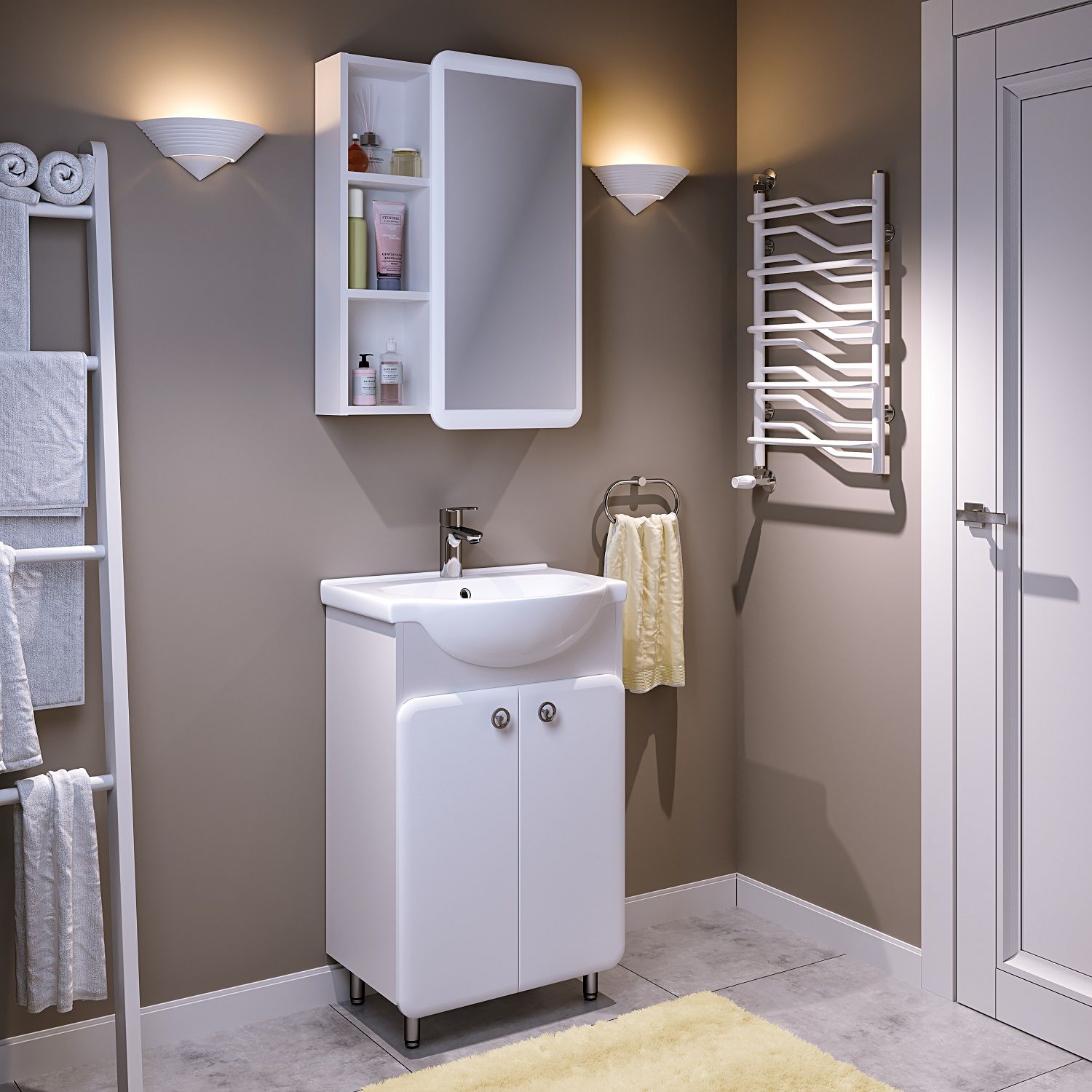 Тумба под умывальник напольная с двумя распашными дверками и одной внутренней полкой. Петли со встроенным доводчиком, ручки - 2шт, ножки хром - 2шт, ножки пластик -2шт.