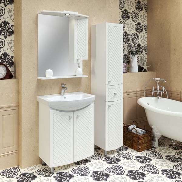 Тумба под умывальник напольная с двумя распашными дверками и одной внутренней полкой. Петли со встроенным доводчиком, ручки - 2шт, ножки хром - 2шт, ножки пластик -2шт.