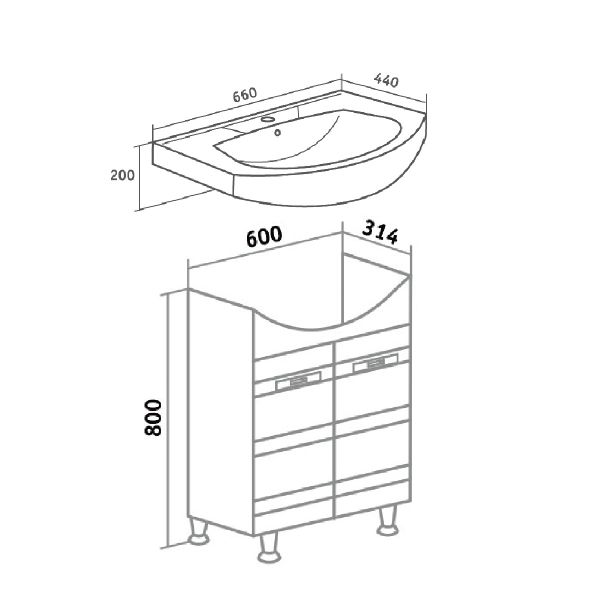 Тумба под умывальник напольная с двумя распашными фасадами и одной внутренней полкой. Петли со встроенным доводчиком, ручки - 2шт, ножки хром - 2шт, ножки пластик -2шт.