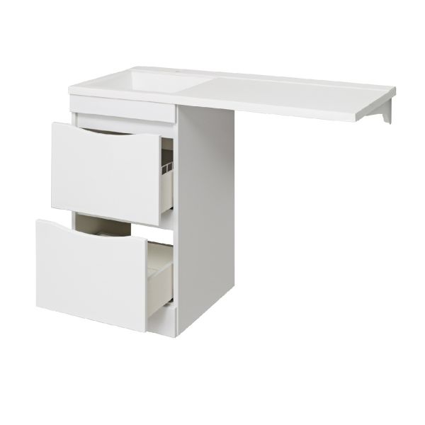 Тумба под умывальник напольная с двумя выдвижными ящиками на шариковых направляющих скрытого монтажа с доводчиком. Устанавливается на 4-е пластиковые опоры, скрытые за нижней съемной фальшь-панелью. Комплект предусматривает установку стиральной машины под крылом умывальника слева от тумбы. Умывальник из литьевого мрамора "Gamma 105 лайт" устанавливается на тумбу и кронштейн.