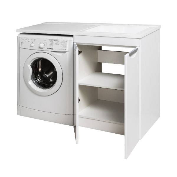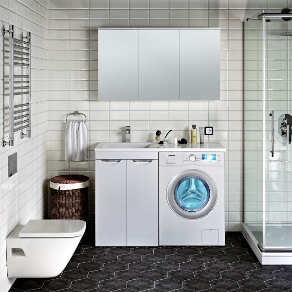 Тумба "Лира" 60 см напольная с двумя распашными дверками и одной встроенной полкой. Устанавливается на 4-е пластиковые опоры, скрытые за нижней съемной фальшь-панелью. Комплект предусматривает установку стиральной машины под крылом умывальника . Умывальник из литьевого мрамора "Gamma 120 лайт" устанавливается на тумбу и кронштейн.