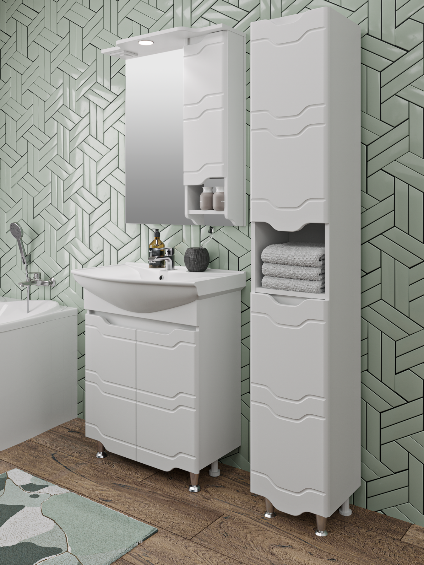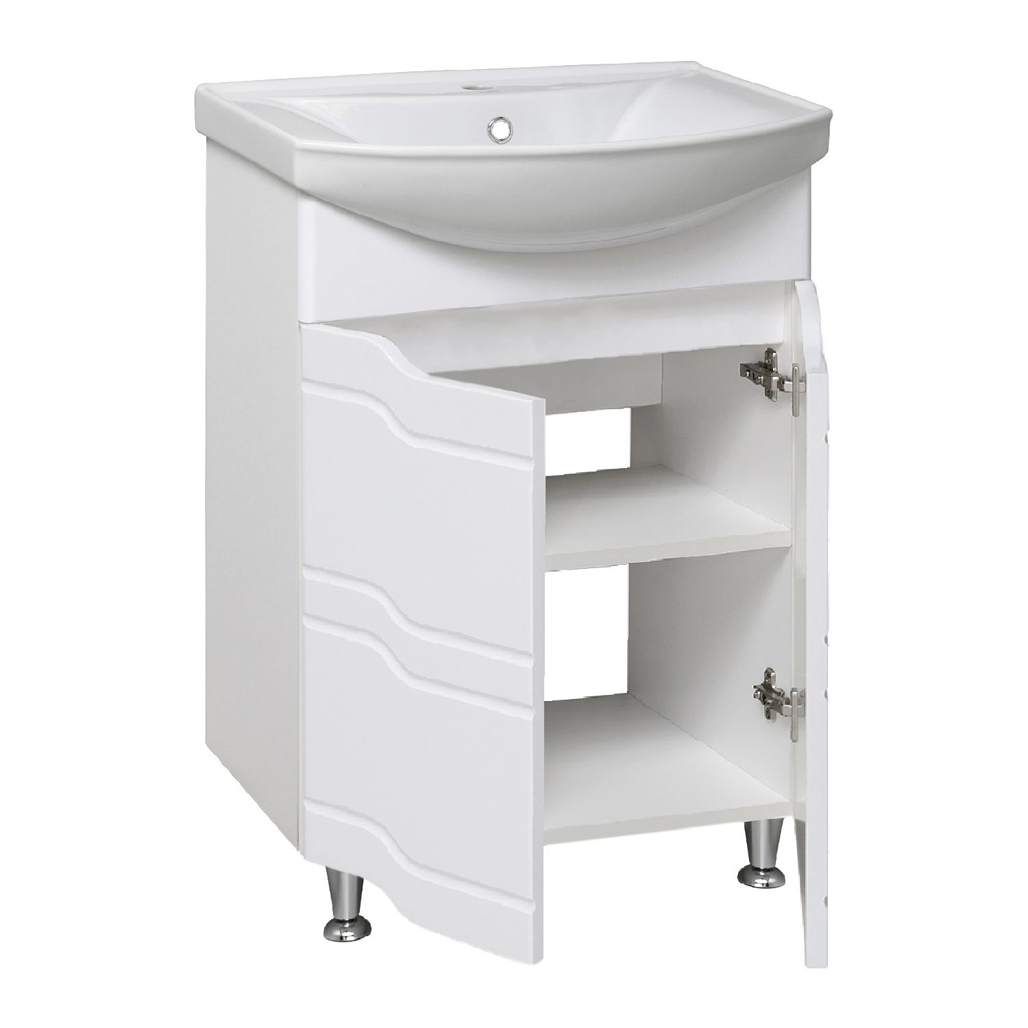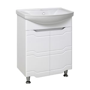 Тумба под умывальник напольная с двумя распашными фасадами и одной внутренней полкой. Петли со встроенным доводчиком, ножки хром - 2шт, ножки пластик -2шт.