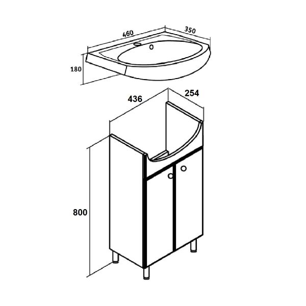 Тумба под умывальник напольная с двумя распашными фасадами и одной внутренней полкой. Петли со встроенным доводчиком, ручки - 2шт, ножки хром - 2шт, ножки пластик -2шт.