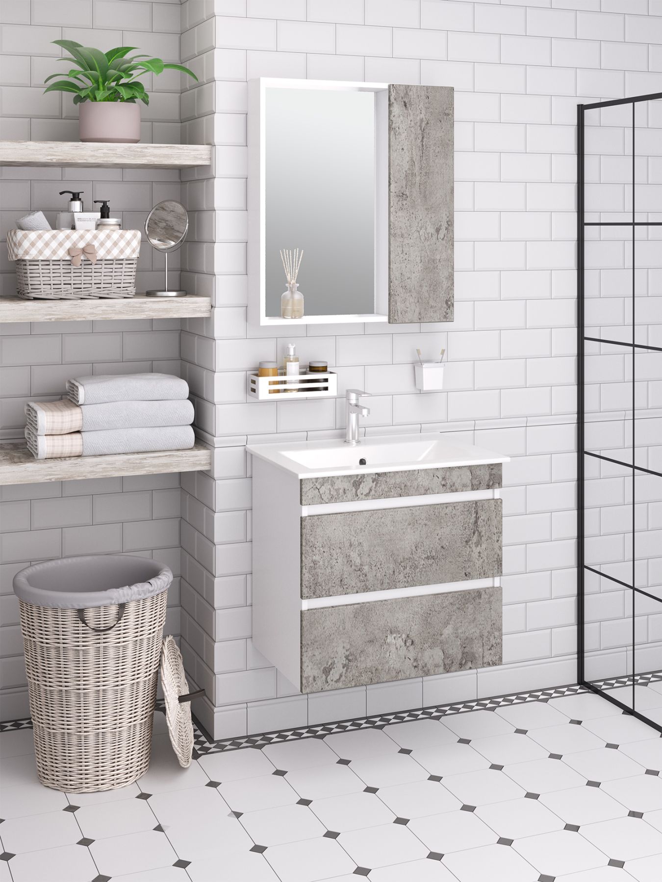 Коллекция мебели "Манхэттен" выполнена в современном стиле. Корпус изделий изготовлен из белого ЛДСП, а фасады облицованы матовой пленкой ПВХ цвета "серый бетон". Тумба под умывальник подвесная с двумя выдвижными ящиками на шариковых направляющих с доводчиком. Навесы - 2шт.