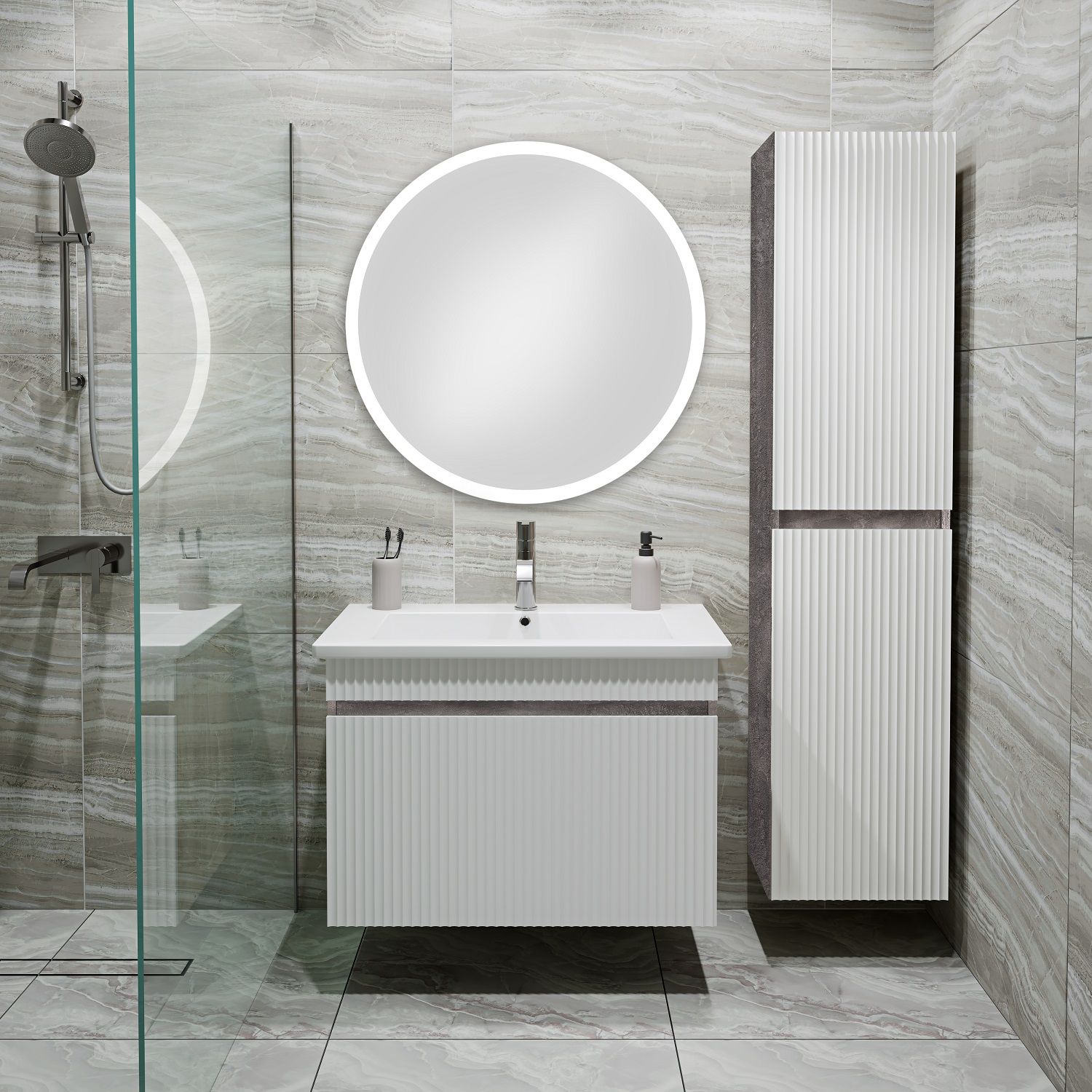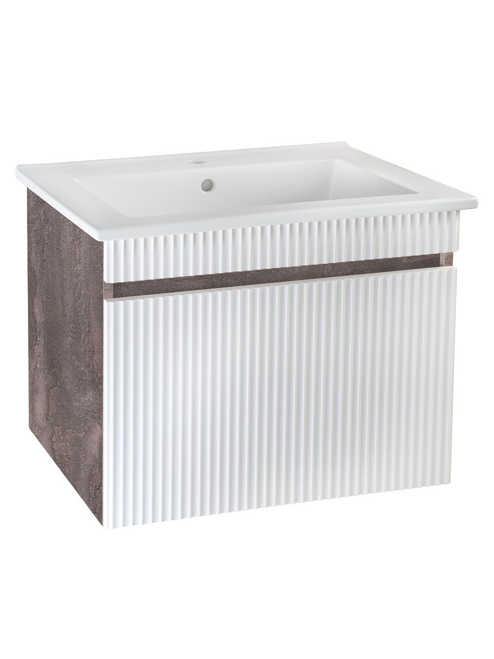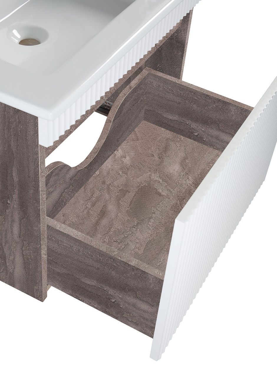 Тумба с раковиной RUNO МОДЕНА – это изысканность и утончённая роскошь в интерьере. Волнистые рифленые фасады визуально «оживляют» и «приводят в движение» всю обстановку комнаты, сохраняя при этом умиротворение и покой, превосходно сочетаются с древесной фактурой и текстурой необработанного натурального камня корпуса. В комплект мебели входят: тумба с раковиной. Тумба под раковину в ванную Модена оснащена выдвижным ящиком на шариковых направляющих. Цвет корпуса в двух цветах: текстура светлого дерева или необработанного натурального камня. Цвет фасада классический – белый глянец, идеально впишутся в любой интерьер ванной комнаты. Тумба для ванной комплектуется накладной керамической раковиной «Оскар» (770х470 мм). Раковина глубиной 19 см. Мебель для ванной RUNO - красота и практичность в мелочах, комплект мебели Модена – лучший выбор для Вашей ванной комнаты!