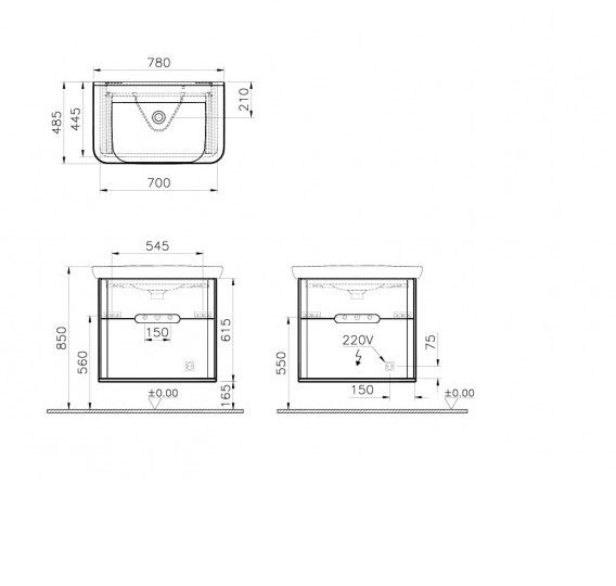 Шкаф Sento с раковиной, с 2 ящиками, 80 см, с LED подсветкой, цвет матовый антрацит ( ножки 61069 заказываются отдельно )