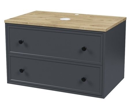 Вместительная подвесная тумба Torr трендового темно-серого цвета со столешницей из МДФ в оттенке дуба верона. Сочетает в себе узнаваемый стиль и практичность популярного скандинавского дизайна. Ее четкие формы, теплый цвет дерева, фасады с декоративной филенкой, круглые ручки смотрятся гармонично и впишутся в любой современный интерьер. Подойдет любой накладной умывальник, покупается отдельно.