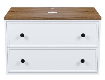 Вместительная подвесная тумба Torr классического молочно-белого цвета со столешницей из МДФ в оттенке ореха макадамия. Сочетает в себе узнаваемый стиль и практичность популярного скандинавского дизайна. Ее четкие формы, теплый цвет столешницы, фасады с декоративной филенкой, круглые ручки смотрятся гармонично и впишутся в любой современный интерьер. Подойдет любой накладной умывальник, покупается отдельно.
