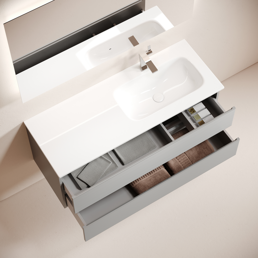 • Тумба с двумя выдвижными ящиками и с доводчиками скрытого монтажа