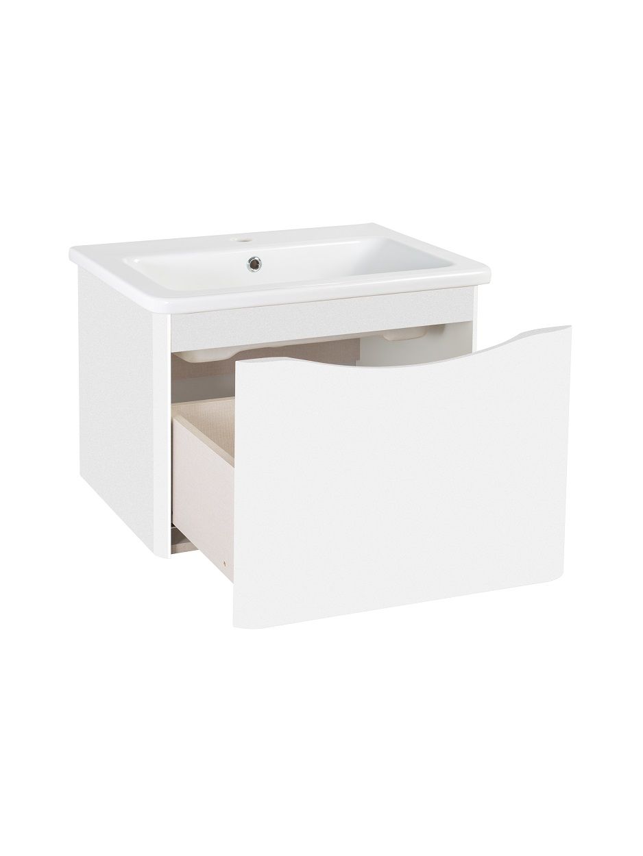 Тумба с раковиной в ванную Runo Тоскана (подвесная) - выполнена в ультрасовременном дизайне в классическом белом цвете. Тумба под раковину отличается изысканным дизайном, скруглённые углы тумбы, древесная текстура фасада, врезная ручка – придают мебели необычный и незабываемый внешний вид. Тумба в ванную оснащена выдвижным ящиком на шариковых направляющих, с системой плавного закрывания. Тумба под раковину ТОСКАНА гармонично впишется в любой интерьер ванной комнаты. Тумба для ванной комплектуется накладным керамическим умывальником Никсон 60 (600х460 мм) ТМ Dreja, необычный дизайн которого сочетание строгих линий прямоугольника со скруглёнными углами, отражают современные тренды в дизайне. Раковина глубиной 16 см. Мебель для ванной комнаты RUNO - красота и практичность в мелочах!