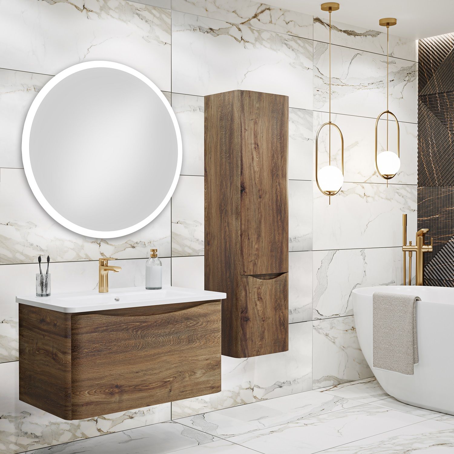 Тумба с раковиной в ванную Runo Тоскана (подвесная) - выполнена в ультрасовременном дизайне в цвете темное дерево. Тумба под раковину отличается изысканным дизайном, скруглённые углы тумбы, древесная текстура фасада, врезная ручка – придают мебели необычный и незабываемый внешний вид. Тумба в ванную оснащена выдвижным ящиком на шариковых направляющих, с системой плавного закрывания. Тумба под раковину ТОСКАНА гармонично впишется в любой интерьер ванной комнаты. Тумба для ванной комплектуется накладным керамическим умывальником Никсон 80 (800х460 мм) ТМ Dreja, необычный дизайн которого сочетание строгих линий прямоугольника со скруглёнными углами, отражают современные тренды в дизайне. Раковина глубиной 16 см. Мебель для ванной комнаты RUNO - красота и практичность в мелочах!