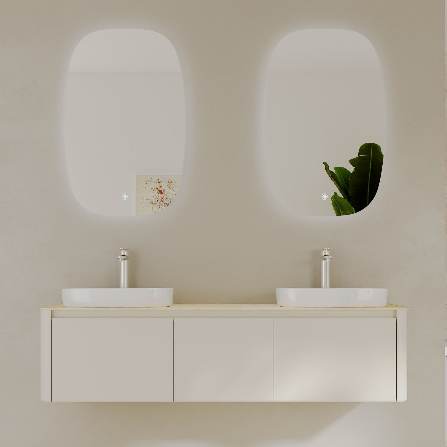 Минималистичная мебель датского производителя Black&White в габаритных размерах 160×55 см. Столешница выполнена из утонченного керамогранита стилизованного под натуральный мрамор кремового цвета в сочетании с белой основой . Полувстраиваемые раковины поставляются вместе с донным клапаном и изготавливаются из сантехнического фарфора, а невысокие борта позволяют устанавливать смеситель любой высоты. База изготовлена из влагостойкого MDF и покрыта эмалью в цвете слоновая кость, а для открывания выдвижных ящиков установлены направляющие австрийской компании Blum. Комплект крепежа с крепежной планкой идет в комплекте.