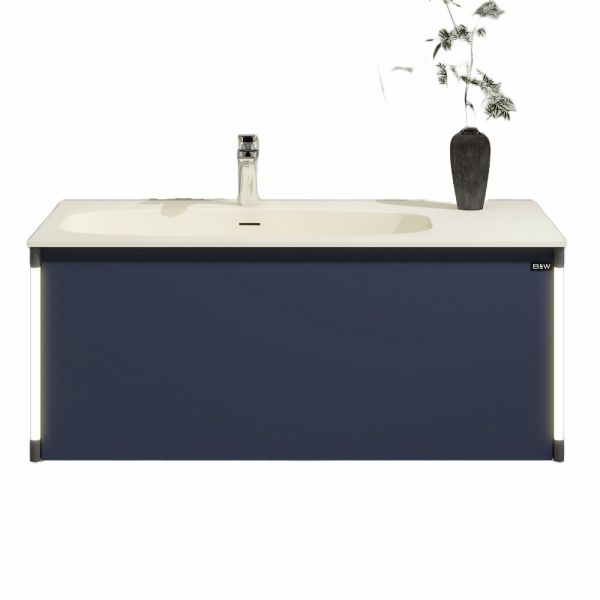 Тумба с раковиной для ванной комнаты датского производителя Black&White в габаритных размерах 80x52x36 см.Раковина – столешница асимметричной конфигурации с широкой чашей и расширенным местом для хранения  ванных принадлежностей выполнена из не пористого искусственного камня Corian и оснащена донным клапаном хромированного цвета.Тумба производится из девятислойной фанеры и окрашена влагостойкой эмалью глубокого синего цвета.Зона хранения оснащена одним выдвижным ящиком с высоким фасадом, механизм открывания – UniHopper с доводчиками.Важной особенностью является контурная диодная подсветка, которая расположена справа и слева от фасада, установленная на торцы корпуса.Она включается автоматически при приближении человека с расстояния 3-х метров и гаснет спустя 30 секунд после того, как Вы покинули помещение. U 945 – продукт разработанный датскими дизайнерами, в котором собраны все тенденции актуального мебелестроения для комфортного использования зоны умывания, а также наполнения ванной комнаты комфортом и уютом.