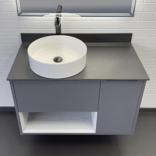 Тумба с раковиной Comforty Джанкой 00-00013694 90 см АнтрацитПодвесная тумба с одним ящиком и створкой оборудованными системой плавного закрывания. Предусмотрено пространство для открытого хранения. На фасадах тумбы черные матовые алюминиевые ручки. круглая раковина-чаша установлена на столешницу из керамогранита. В комплекте также пристенный плинтус. Ниша открытого хранения сделана из МДФ в пленке серого цвета с текстурой дерева. Торцы вставки спилены под углом.Характеристики:Тумба:Цвет: антрацит.
