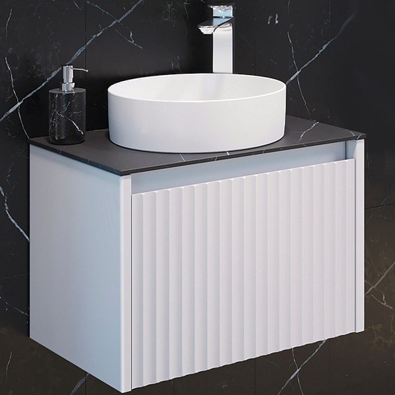 Тумба укомплектована столешницей из черного керамогранита под мрамор Калакатта Блэк с бортиком.