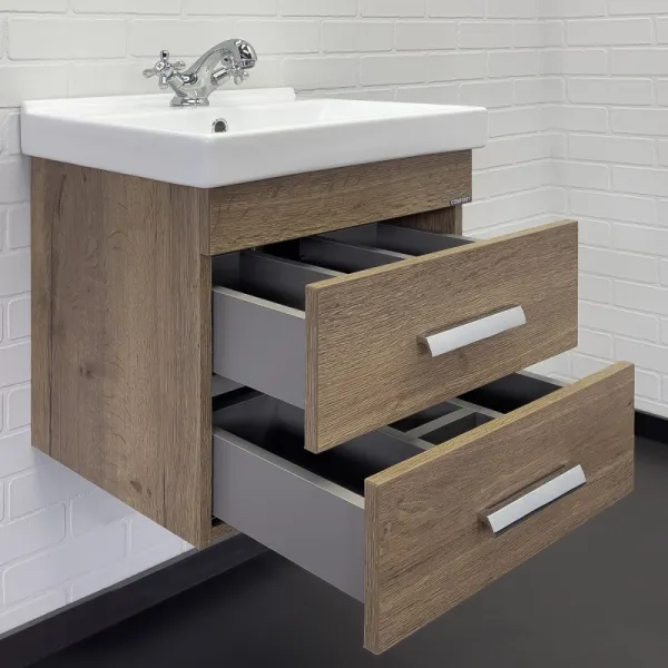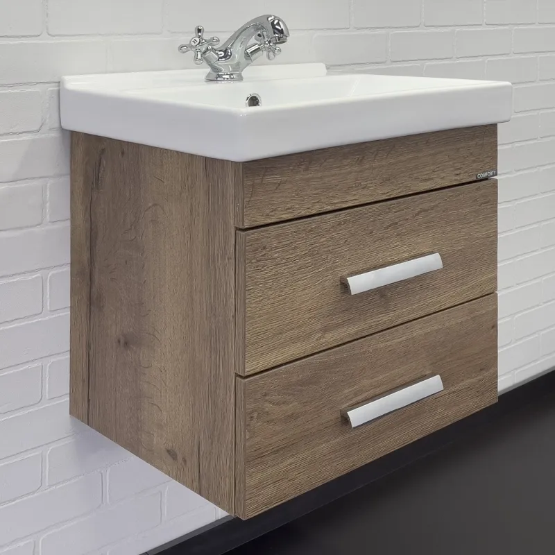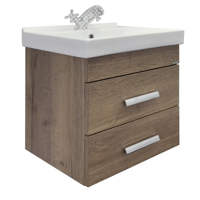 Тумба с раковиной Comforty Никосия 00-00018026 50 см дуб темныйПодвесная тумба с двумя выдвижными ящиками, оснащенным системой плавного закрывания. Тумба подготовлена для подключения водоснабжения снизу. В комплекте: керамическая раковина Fest 50