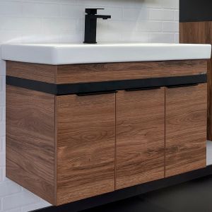 Тумба с раковиной Comforty Соло 00-00010979 90 см Дуб темно-коричневыйПодвесная тумба-умывальник с широкой прямоугольной чашей. Для сохранения геометрических размеров конструкция тумбы усилена металлической рамой окрашенной в цвет черный муар. Створки оборудованы петлями с механизмами плавного закрывания. Фасад и корпус созданы по уникальной технологии синхронного тиснения в декоре Дуб темно-коричневый, который при прикосновении дарит ощущение натуральной древесины.