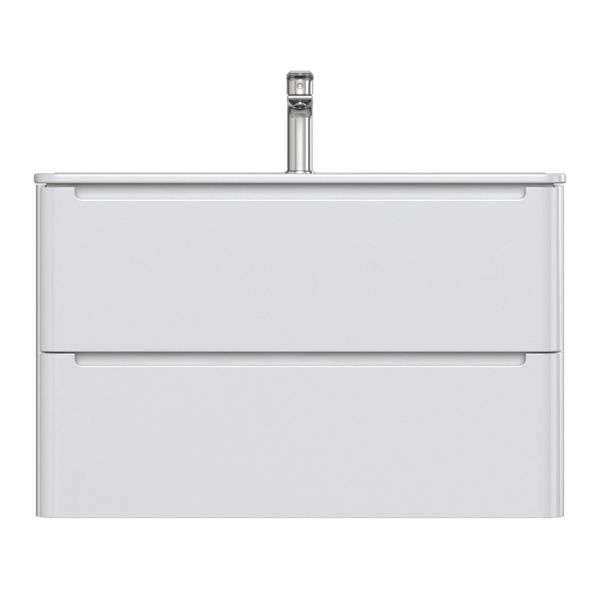 Тумба с умывальником для ванной комнаты, подвесная. Размеры: 467х802х500 мм (ДхШхВ). Фасад МДФ 19 мм в эмали , фрезеровка. Корпус ЛМДФ 16 мм в эмали. Интегрированные ручки. Два выдвижных ящика с механизмом плавного доведения. Пластиковый ограничитель под сифон в верхнем ящике. Перекатной органайзер в нижнем ящике. Навесы усиленные с планкой. Упаковка: картон, пленка, пенопластовые уголки.