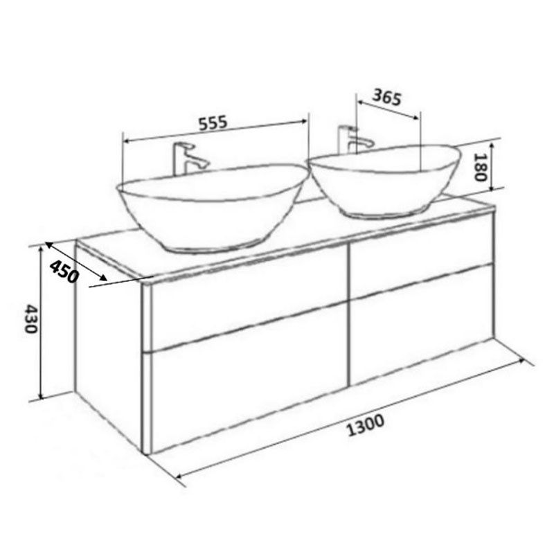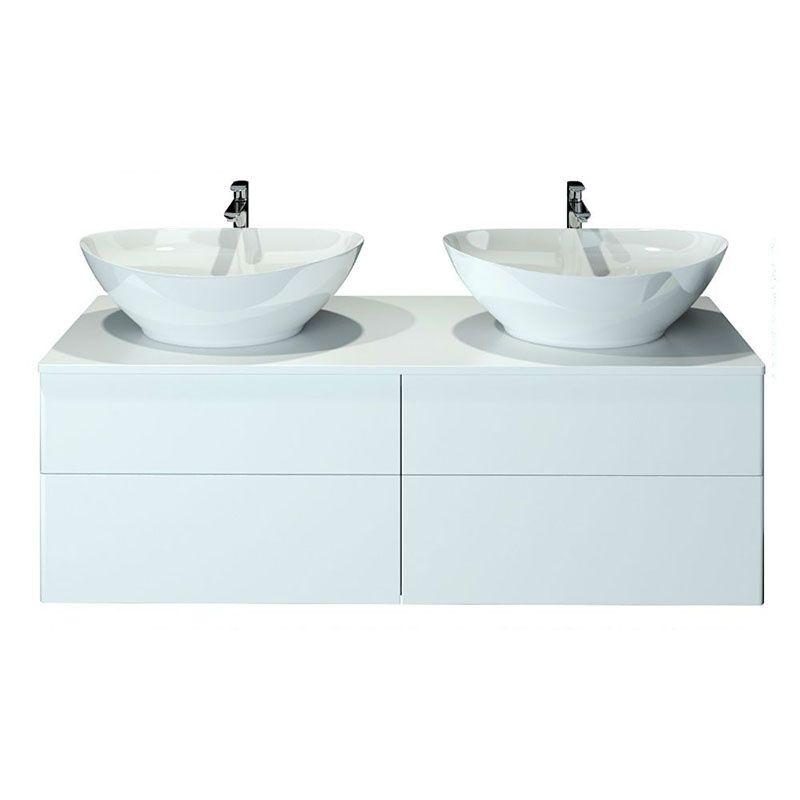 Подвесная тумба с двумя раковинами и столешницей МДФ, с четырьмя выдвижными ящиками. Предназначена для использования в ванных комнатах с повышенной влажностью. Система Push to Open: ящики открываются нажатием на них. Высокое качество сборки, материалов и фурнитуры. Столешница, корпус и фасад: МДФ, плёнка ПВХ белая глянцевая. Раковины накладные (глубина 10 см) - фаянс.