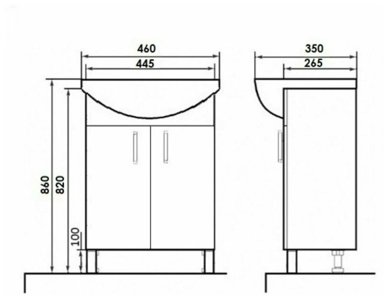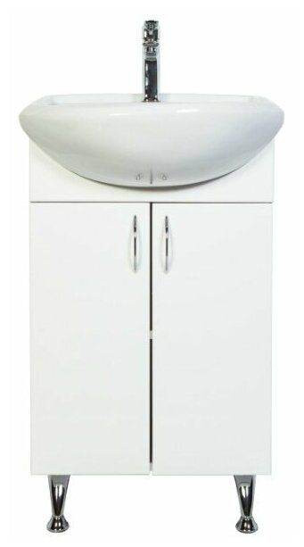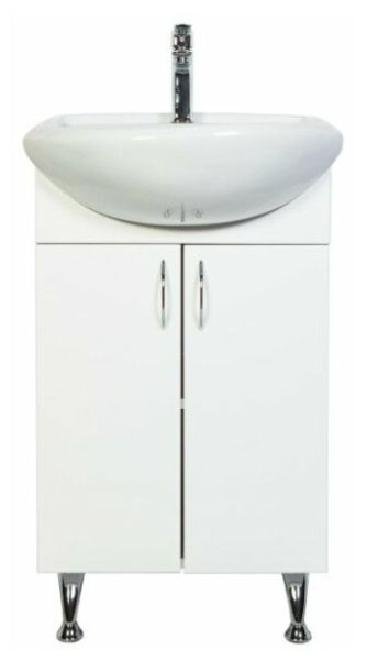Напольная тумба с раковиной. Дверки c механизмом доводчика, обеспечивающим плавное закрывание. Фасад МДФ в пленке, цвет белый глянец. Корпус ЛДСП - белый глянец. Раковина - фарфор. Фурнитура в цвете хром. В комплекте н-р ножек и внутренняя полочка. Зеркальный шкаф для комплекта (арт. LA-45TUW+RA) приобретается дополнительно.