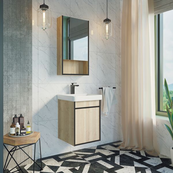 Подвесная тумба-умывальник оснащена створкой с системой Push-to-open (открытия от нажатия).