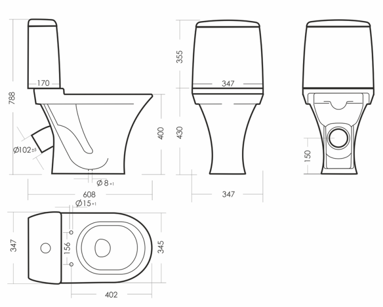 Размеры унитаза-компакта: 347 x 608 x 788